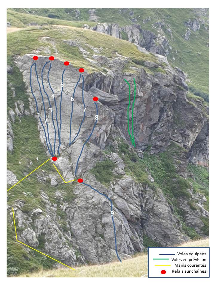 Equipement : Spits provided by the Commune of Aussois, the way is equipped. Relay on chain. Do not touch the equipment in place.